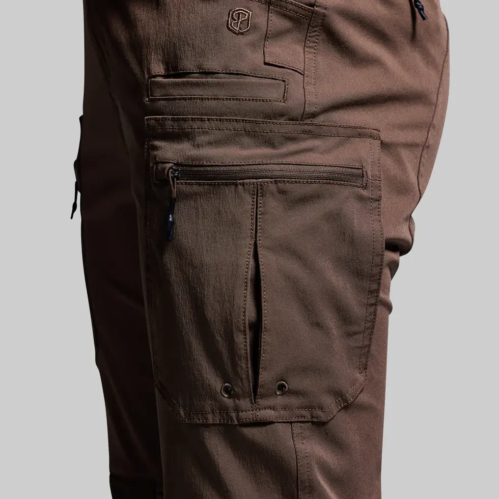 Body 1: 94% nylon, 6% spandex Body 2: 70% nylon, 20% polyester, 10% spandex Waistband Lining: 90% polyester, 10% spandex Other: 100% polyester Abrasion resistant stretch fabric w/ extra stretch panels at seat and knees Large front pockets w/ mesh pocket bags & coin pockets 2 ply knife reinforcements at the edge of front pockets Large Low-Profile, zippered cargo pockets featuring: Bellowed Fabric to expand pockets Drainage holes to dump water/debris Inner elastic strap to secure large objects (Water bottle / magazines) Small, zippered dip pockets at front legs Ballistic Nylon reinforced knees w/ stretch panels for extra mobility Inner knee pad pockets w/ Velcro closure & drainage holes to dump water/debris 2 Ply reinforced seat Large belt loops to support any size belt Adjustable velcro tabs at waist Gusseted crotch Zippered back welt pockets with mesh pocket bags